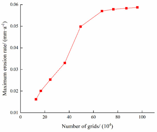 To verify the irrelevance of the grids, a total of nine sets of grids were divided into 127,508, 167,068, 244,718, 363,848, 494,322, 670,322, 763,170, 870,792, and 960,804 for calculation. The maximum erosion rates of the different grids under the same boundary conditions and calculation method (Table 2) were obtained (Figure 4).
