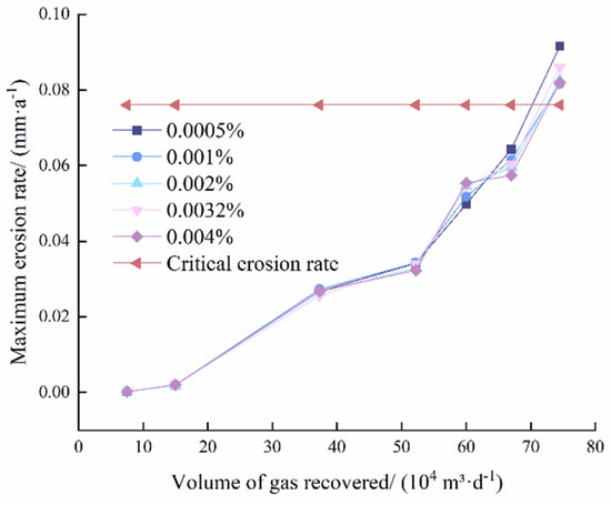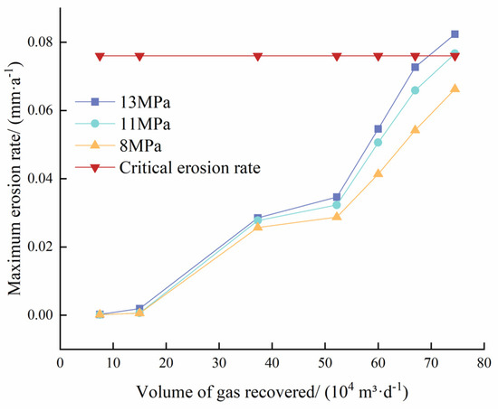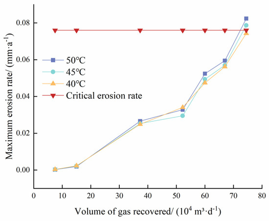 Figure 5 shows the variation rule of the maximum erosion rate with gas extraction under different pressures. The results show that the maximum erosion rate of the tee decreases when the outlet pressure decreases. The reason is that, when the pressure inside the tube is reduced when the gas density is reduced, obtained from Formula (7), when the gas density is reduced when the particles are subjected to drag force reduction leads to a reduction in the speed of the particles, and then, the kinetic energy of the particles is reduced. The maximum erosion rate at different temperatures with the change rule of gas extraction is shown in Figure 6. It can be seen from the figure that the maximum erosion rate of the tee is basically the same under the low-gas extraction; when the gas extraction is larger, the maximum erosion rate of the tee decreases significantly. The reason is that the gas movement in the tube is slow under low-gas extraction, and the increase in temperature does not have a significant effect on the erosion of the tee; under high-gas extraction, when the temperature increases, the gas density decreases to make the gas volumetric flow rate larger, which makes the gas flow rate increase, resulting in more serious erosion; when the gas temperature decreases, the gas density increases, which makes the gas volumetric flow rate smaller (Figure 7), which makes the gas flow rate decrease. The erosion is small. Therefore, when the pressure is greater than 11 MPa or the temperature is greater than 45 °C and the gas extraction volume is greater than 70 × 104 m3/d, the maximum erosion rate of the tee is greater than the critical erosion rate of 0.076 mm/a, and the safety of the tee is seriously threatened at this time.