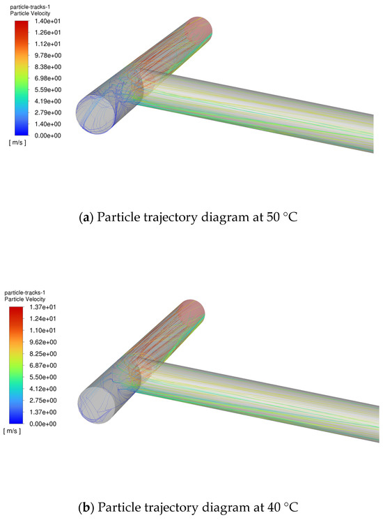 When the pressure in the tube is 13 MPa, 11 MPa, and 8 MPa and the temperature is 50 °C, 45 °C, and 40 °C, respectively, we obtain the change rule of the maximum erosion rate of the tee with the pressure and temperature; the particle trajectory diagram at different temperatures; and the velocity, pressure, and temperature cloud diagrams of the tee at 13 MPa and 50 °C.