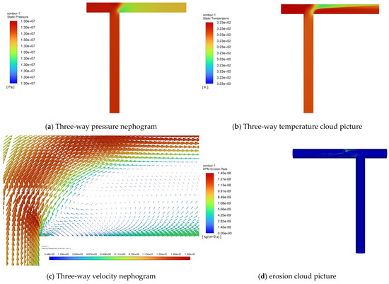 According to the cloud images of pressure, temperature, and velocity (see Figure 8a–c), there was an obvious flow stratification at the intersection of the two pipes. This is because the flow inertia increases the fluid velocity on the upper side of the main pipe, resulting in low pressure and high velocity. Combined with fluid dynamics, it can be seen that the pressure at the intersection is less than that at the outflow section, and the secondary flow area (Figure 8c) appears, which has an impact on the subsequent fluid flow. An erosion cloud diagram of the tee joint is shown in Figure 8d. As can be seen from the figure, the most serious erosion of the tee joint lies in the rear pipe wall at the intersection, and one of them is the most serious erosion. The reason is that the particles are small, and the trajectory of the particles is consistent with the fluid. With the high-speed collision of fluid inertia on the front and rear pipe walls at the intersection, a serious erosion area is produced.