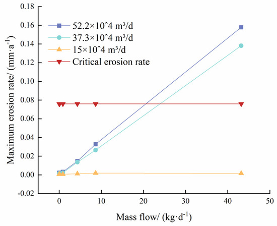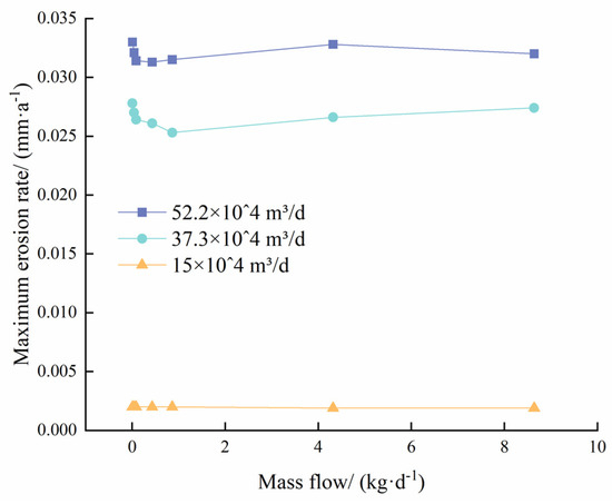 The maximum erosion rate of different sand mass flow rates with the change rule of the gas extraction is shown in Figure 11. The results show that, with the increase in the sand mass flow rate under the same gas extraction, the maximum erosion rate of the tee is basically unchanged. The reason is that the larger particle size salt particles by gravity in the lower part of the pipeline transport (Figure 12c); salt particles with the fluid impact on the back side of the pipe wall at the coherent place due to inertial collision salt particles along the pipe wall transport a distance, while the sand particles, due to their smaller particle size, has free movement with the fluid in the pipeline, resulting in sand particles, and the wall collision frequency did not increase with the increase in the mass flow rate, and the particle velocity did not increase with the increase in mass flow rate. The increase in the particle velocity did not increase with the increase in the mass flow rate and produce changes (Figure 12a,b), so the maximum erosion rate basically remained unchanged.