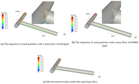 When the sand mass flow rate is 0.00864–8.64 kg/d, the variation law of the maximum erosion rate of the tee with gas production, the particle trajectory diagram of different sand mass flow rates, and the salt particle movement trajectory are obtained.