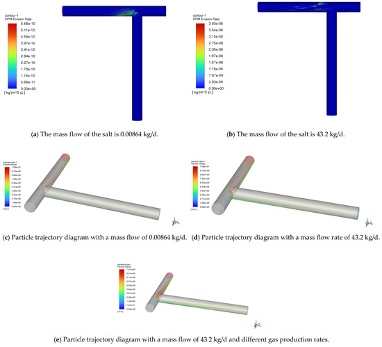 The variation rule of the maximum erosion rate with gas extraction at different salt mass flow rates is shown in Figure 13. The results show that the maximum erosion rate is weakly affected by the salt mass flow rate at low gas extraction rates, and the maximum erosion rate of the tee is linearly correlated with the salt mass flow rate at high gas extraction rates. At different salt mass flow rates, the magnitude and location of the maximum erosion rate of the tee are different (Figure 14a,b). The reason is that the increase in the salt mass flow rate leads to an increase in the number of salt particles (Figure 14c,d), and the increase in the number of salt particles leads to an increase in the erosion of the tee caused by the salt particles when the size of the salt particles is constant. The larger the gas extraction volume at the same mass flow rate, the larger the maximum erosion rate of the tee (Figure 14d,e). When the gas extraction volume is more than 37.3 × 104 m3/d and the salt mass flow rate is more than 25 kg/d, the maximum erosion rate is greater than the critical erosion rate of 0.076 mm/a, and the safety of the tee is seriously threatened at this time.