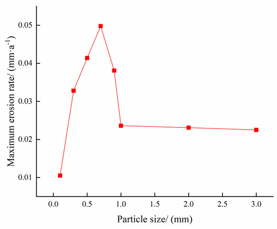 From Section 4.3, it can be seen that there are obvious differences in the erosion of the tee by the two kinds of particles, so the particle sizes of the sand particles and salt particles are analyzed, respectively, and the erosion damage law of each particle under different particle sizes is obtained.