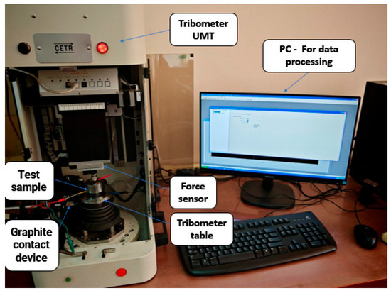 Figure 1 shows the UMT-2 Tribometer equipped with the mounted rotating table, the force sensor applying axial load to the bearing, and the monitor connected to the central processing unit. The figure also shows the graphite contact connection system used to link the rotating table and the fixture holding the bearing’s outer ring to the electrical resistance measuring equipment of the Tribometer. In this way, the monitor displays the variation of the bearing’s electrical resistance over time.