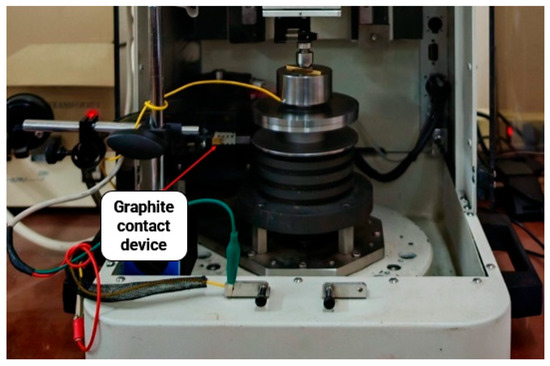 In order to compensate the variation of the electrical resistance during the measurements, it was necessary to introduce a device with a graphite element, which was placed in contact with rotating disc connected to the inner ring of the bearing. A detail of the contact device with the rotating disc is presented in Figure 3.