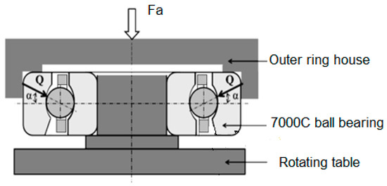 The ball bearing was loaded with a total axial force of 13.11 N consisting of the normal load applied by the tribometer (10 N) and the weight of the outer ring housing. Figure 4 presents the detailed mounting of the 7000C angular contact ball bearing on the rotating table.