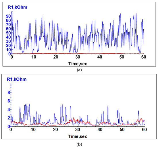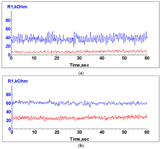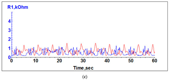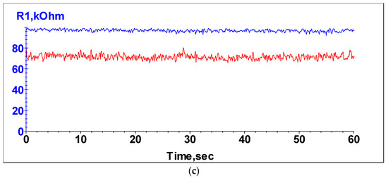 Electrical resistance variation with time for Shell Gadus S2 V100 2 grease (blue) and Shell Helix Hx8 5W-30 oil (red) at medium rotational speeds: (a) 100 rpm; (b) 200 rpm and (c) 500 rpm.