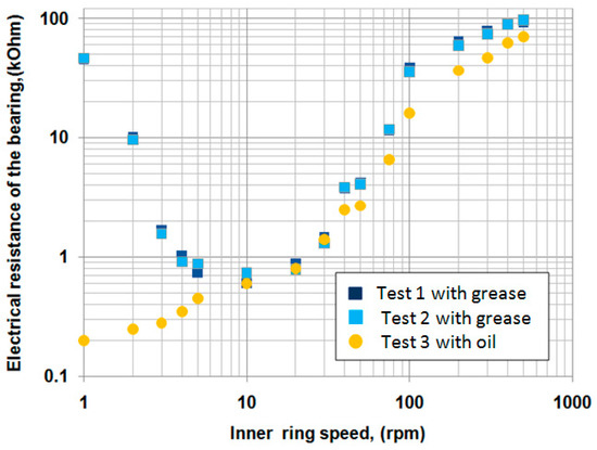Considering the average values of the electrical resistances obtained over the entire rotational speed range from 1 to 500 rpm, in Figure 7 is illustrated the so-called “V-shape pattern” for both grease- and oil-lubricated ball bearing. Thus, considering that high electrical resistance also means a thicker lubricant film, the diagram obtained is similar to those reported in the literature regarding grease film thickness variations measured by optical interferometry [1,3,4,5].