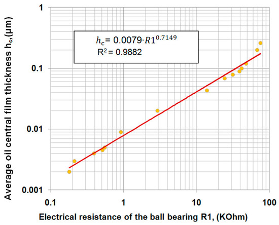 Figure 8 presents, in double logarithmic coordinates, the correlation between the measured electrical resistances of the Shell Helix Hx8 5W-30 oil-lubricated ball bearing and the average of oil film thickness in the central area of the ball–raceway contacts.