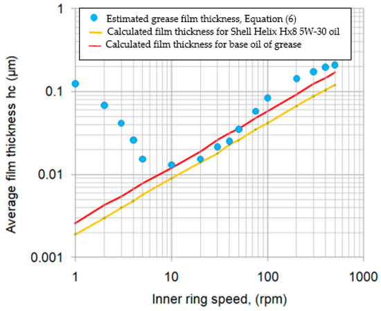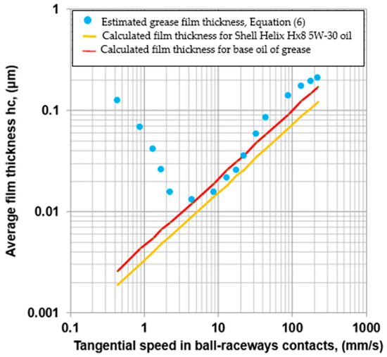 Considering that the electrical resistance in the ball bearing is dictated by the degree of separation of the contacts between the balls and the raceways, both for oil and grease, in Figure 9 is presented the variation of the grease film thickness obtained according to Equation (6), as function on the inner ring speed. Moreover, in Figure 9 is presented the calculated film thickness for both Shell Helix Hx8 5W-30 oil and grease base oil, according to the results calculated in the Appendix B.