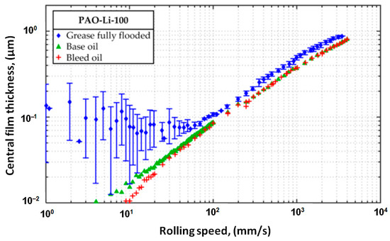 The “V-shape pattern” distribution of the grease film thickness with speed illustrated in Figure 10 is similar to the model reported by Fischer et al. [1], which is presented in Figure 11. Fischer et al. [1] obtained the results by interferometry method in a ball-on-glass disc tribometer using a polyalphaolephin lithium complex grease (PAO-Li-100), with a base oil viscosity of 98.01 mm2/s at 40 °C and 22.14 mm2/s at 80 °C.