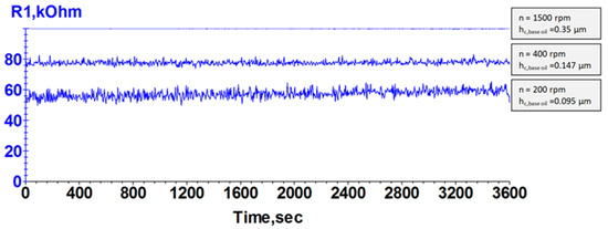 In this study, the authors evaluated the stability of the grease film thickness generated at 8 different rotational speeds between 200 rpm and 1500 rpm by monitoring the variations in ball bearing electrical resistance for 60 min at each speed. To prevent excessive temperature rise, the initial amount of fresh grease was about 0.15 cm3, evenly distributed on both raceways. Figure 12 presents the variation of the electrical resistance at three rotational speeds of 200, 400 and 1500 rpm. For each rotational speed, the average central film thickness of the grease base oil is highlighted.