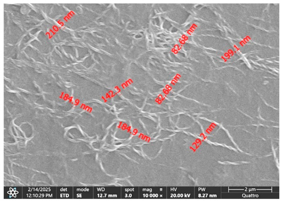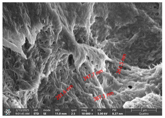 Moreover, to highlight any changes in the grease microstructure, samples of the fresh and stressed grease after 8 operating hours were analyzed using the scanning electron microscopy (SEM) Quattro C (Thermo Fisher Scientific, Brno, Czech Republic). Figure 13 presents the fresh grease microstructure at a magnification of 10,000×.