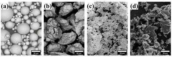 SEM micrographs of the raw powders used for the Ti-30Zr-10Ta-xB fabrication: (a) Ti, (b) Zr, (c) Ta and (d) B particles.