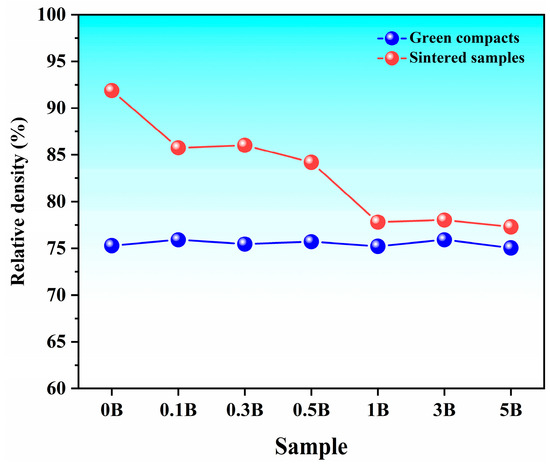 The relative density of samples in both green and sintered states is shown in Figure 2. As observed, the relative density of green compacts is not affected by the amount of B, reaching values close to that of the 0B sample. This suggests proper particle assembly during the rearrangement of particles with different mechanical properties, shapes, and sizes in the green compacts. Additionally, the sintering process caused densification of the samples due to coalescence between particles with higher solubility, such as Ti-Zr and Ti-Ta pairs [32,33], which enhances powder sinterability and allows the base alloy to achieve relatively high density values. However, Zr-Ta pairs are an exception; according to the equilibria diagram [34], their very limited solubility at low temperatures increases only above the eutectoid temperature (~1060 °C) and is restricted by a miscibility gap, which limits the sintering of this pair and reduces their contribution to the final densification. Although a reasonable densification of 22% was achieved, this effect prevented the 0B sample from reaching a relative density comparable to other Ti-Zr alloys made by powder metallurgy (98%) [35]. Furthermore, the addition of boron gradually decreased the relative density of the base alloy. This decline is linked to the solid insolubility between boron and the components of the base alloy, as well established in the binary phase diagrams [36,37,38]. Consequently, unreacted boron particles and intermetallic formations can hinder particle contact, impede solid-state sintering, and promote pore formation, ultimately reducing the densification of the samples.