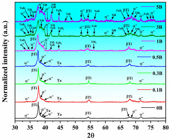Figure 3 shows the diffraction patterns of the sintering samples. As observed, the pattern of the 0B sample mainly consists of reflections corresponding to the bcc β-Ti, which was identified using PDF 44-1288 from the ICSD database. Additionally, Ta reflections (04-0788) are present in the base alloy, indicating the existence of undissolved particles. Although Zr is considered a neutral element for phase stabilization of Ti, it has been found that Zr can exert a β-Ti stabilization effect depending on the content of other β-stabilizing elements and impurities [4]. Therefore, the amount of Ta, a strong β-stabilizer, produced a significant stabilizing effect on the β-Ti phase in the 0B sample [39]. Furthermore, the pattern of the 0B sample also shows a martensitic orthorhombic α″ phase with a space group Cmcm, which is an intermediate structure formed during the β→α′ transformation, especially with higher concentrations of β-stabilizing elements [40]. A.V. Dobromyslov et al. [41,42] investigated the formation of the orthorhombic α″ phase in various binary Ti and Zr alloys by quenching from the β phase and using different alloying elements. They reported α″ formation with elements such as Ta, Mo, Nb, W, Re, and Ru, with the maximum occurrence in the Ti-Ta system. However, Zr was excluded as a causative factor in the transformation due to the size mismatch, meaning the α″ phase does not form when this mismatch exceeds a certain level.