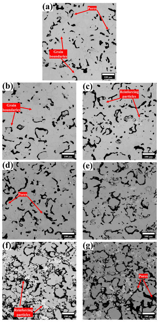 Metallographies of the Ti-30Zr-10Ta alloys with boron additions are shown in Figure 4. As seen, the grain boundaries of equiaxed β-Ti grains are visible within the base alloy matrix. A very low level of chemical etching was used to observe the microstructure without affecting the visualization of in situ reinforcing particles. Remaining closed pores due to incomplete coalescence of particles, a characteristic of the conventional sintering process, are observed in samples with low boron concentrations (Figure 4a–d). The porosity of these samples increased slightly with boron addition. However, in samples with higher boron levels (Figure 4e–g), porosity increased significantly, resulting in open, interconnected pores caused by the obstruction effect of boron particles on contact between matrix particles. A contribution to this high porosity level is also from the in situ reaction of boron particles forming intermetallic phases detected in the XRD analysis. Based on the ΔG values of reactions between the alloy components and boron, high exothermic responses are expected during the formation of these intermetallics, which can increase porosity in the matrix [50]. The porosity observed in the samples aligns well with the relative density shown in Figure 2.