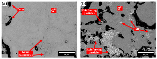 As shown in Figure 4, for the samples with lower boron additions, only a few intermetallic clusters precipitate on the matrix alloy, and their number increases with more boron added. Clearly, the limited number of intermetallic clusters and their locations do not hinder contact between the matrix particles, suggesting that the decrease in relative density observed in the 0B sample is mainly due to reactions during intermetallic formation. However, for samples with higher boron additions, intermetallic clusters form near the matrix particles, leading to porosity. Micrographs of the 0B and 5B samples acquired using BSE are shown in Figure 5. In Figure 5a, the prior β-Ti equiaxed grains are outlined by grain boundaries, which display a fine needle-like microstructure corresponding to the α″ transformation of the base alloy that occurred during sintering [51].