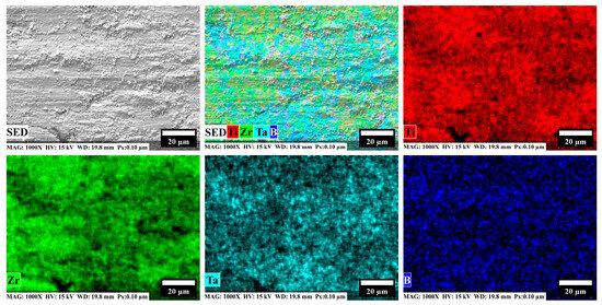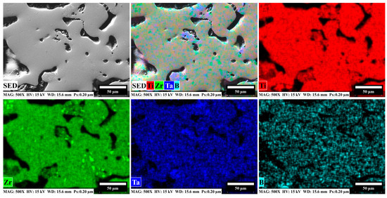 Additionally, Figure 5b, which shows the other samples containing boron, reveals a slight contrast between the intermetallic particles and the matrix. This contrast is caused by differences in atomic numbers, which are distinguished by the BSE technique. The image illustrates the location and distribution of the intermetallic particles, which were synthesized in situ within the matrix alloy and inside the pores. In this image, TiB whiskers are visible within the matrix. The TiB whiskers resulted from a coherent reaction between Ti and boron particles, Ti + B → TiB, possibly formed from TiB2 particles that were depleted to create TiB, according to the reaction Ti + TiB2 → 2TiB. Both reactions occur spontaneously due to their lower free energy (see Table 1) [28,53]. In Figure 6, EDS mappings of the 5B alloy are shown, illustrating the distribution of elements within the microstructure. The main elements in the alloy—Ti, Zr, and Ta—are distributed throughout the analyzed area, with Zr- and Ta-rich zones resulting from incomplete particle diffusion. Although identifying light elements like boron using EDS is challenging, EDS mapping enables the detection of boron concentrations dispersed throughout the matrix and located mainly in quiet zones, as particles within the Ta-rich regions. As observed in the reference SEM image, boron particle accumulations are primarily composed of Ta and boron. These are clearly identified by their whisker shape, which is characteristic of Ti and Ta borides.