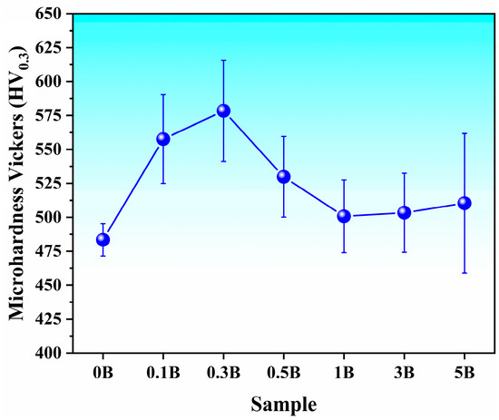 Hardness is a key mechanical property that strongly correlates with a material’s wear resistance, as it indicates the material’s ability to resist plastic deformation and surface damage [54]. In this context, the hardening resulting from the solid solution of elements into a Ti matrix and the precipitation of reinforcing phases plays a vital role in the alloy’s wear behavior. The Vickers microhardness values for the samples in this study are shown in Figure 7. As observed, the microhardness of the 0B sample exceeds that of Ti-Zr alloys produced through powder metallurgy, which had a maximum of 343 HV [35]. This difference is attributed to the high level of solid solution hardening achieved during processing, which is due to the 10 wt.% of Ta in the base alloy, as explored by the authors elsewhere [55]. Conversely, the lowest boron additions increased the microhardness of the Ti-30Zr-10Ta alloy by up to 19.6%, reaching the maximum at 0.3 wt.% boron. This increase can be attributed to the dissolution of boron into the base alloy lattice, resulting in effective hardening. Additionally, higher boron concentrations led to increased porosity levels, resulting in a reduction in microhardness, which leveled off at around 500 HV in the samples with the highest boron content. Unlike the microhardness improvements observed in a Ti6Al4V alloy reinforced with similar boron percentages [28], the results presented here demonstrate the effectiveness of the reinforcement despite notable decreases in relative density.