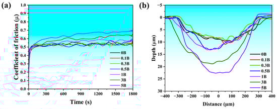 (a) Coefficient of friction recorded during the reciprocating test and (b) wear profiles obtained from the center of the wear tracks of Ti-30Zr-10Ta samples with different boron additions.