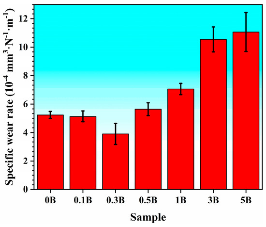 Specific wear rates calculated from the volumes of the wear tracks of Ti-30Zr-10Ta samples with different boron additions.