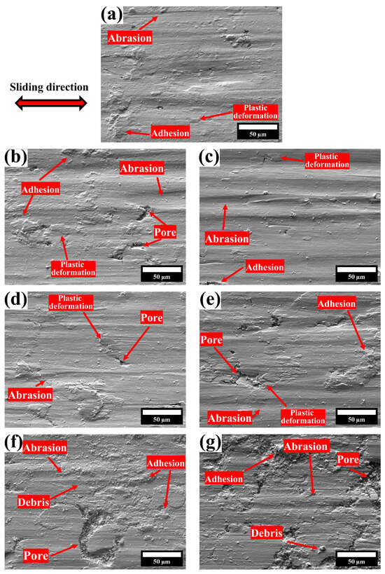 Although the wear rates of the samples follow the microhardness trend, determining the wear mechanism is essential to elucidate the contribution of the overall characteristics of the alloys and the role of the reinforcement particles, which can act as three-body abrasives that increase the wear, to the wear rates achieved by the samples. In order to evaluate the wear mechanisms involved in the dry wear of the Ti-30Zr-10Ta alloy with boron additions, SEM images of the worn surface acquired at the center of the wear tracks are shown in Figure 10. As observed, abrasion is the primary wear mechanism present in all samples, characterized by the formation of grooves aligned with the sliding direction. Those grooves were created by the material that was pulled out of the matrix (debris) and were dragged until they adhered to the surface. Plastic deformation zones were also detected, which are the sources for the dragged material. The plastic deformation in the sliding surface of a metallic material is often associated with a low strain hardening ability, which is accompanied by low resistance to shear stress [28]. Additionally, the plasticity of the surfaces is indicated by the dragged material filling the pores, as shown in Figure 10a, allowing for the determination of plastic deformation as the secondary mechanism dominating the wear of Ti-30Zr-10Ta alloys with low boron concentrations.