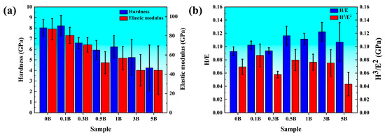 (a) Hardness and elastic modulus obtained by instrumented indentation and (b) the H/E and H3/E2 ratios of polished surfaces of Ti-30Zr-10Ta samples with different boron additions.