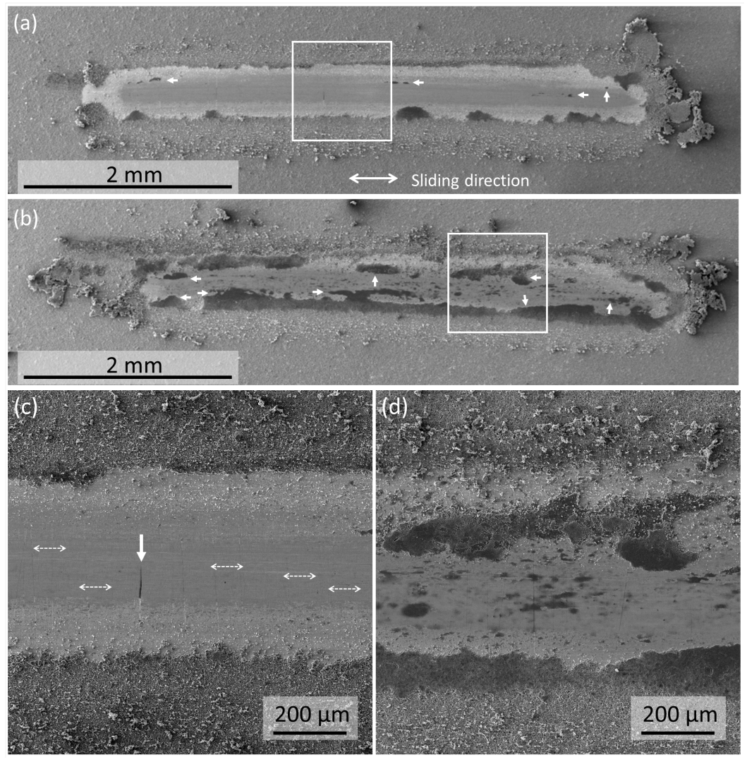 3.2. Wear Track Morphology and Mechanisms