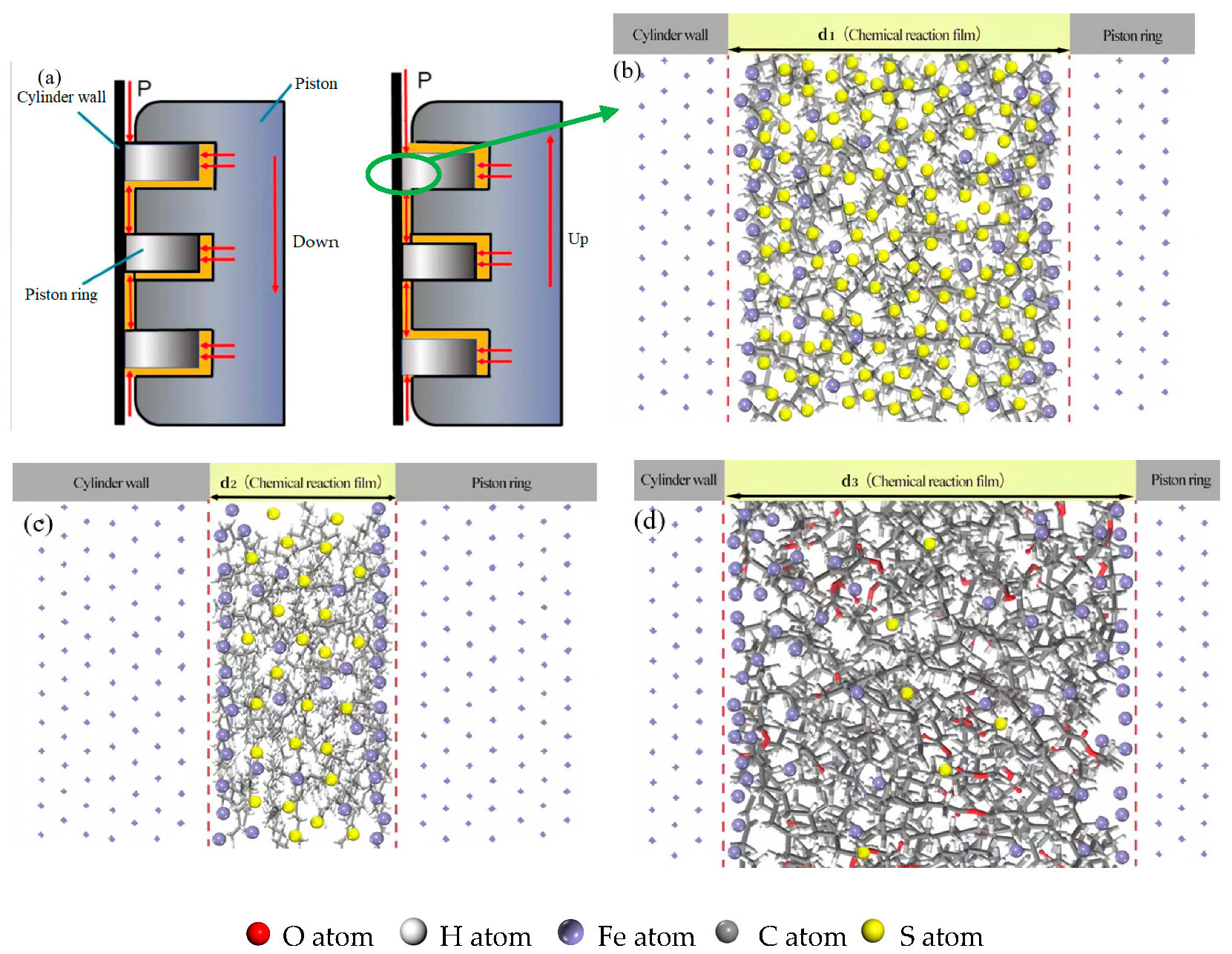 - The addition of biodiesel to low-sulfur diesel systems effectively enhances the lubrication performance of diesel engine friction pairs. This improvement primarily originates from the unsaturated bonds and carbonyl functional groups in biodiesel molecules, which significantly strengthen the chemical adsorption capacity of biodiesel components on metal surfaces. Compared to low-sulfur diesel, this stronger adsorption not only promotes the formation of a thicker tribochemical reaction film but also establishes more robust bonding between the film and the metal surface, thereby improving adsorption stability. This firmly bonded thick tribochemical reaction film can form a stable lubricating layer on friction pair surfaces, consequently effectively reducing wear.