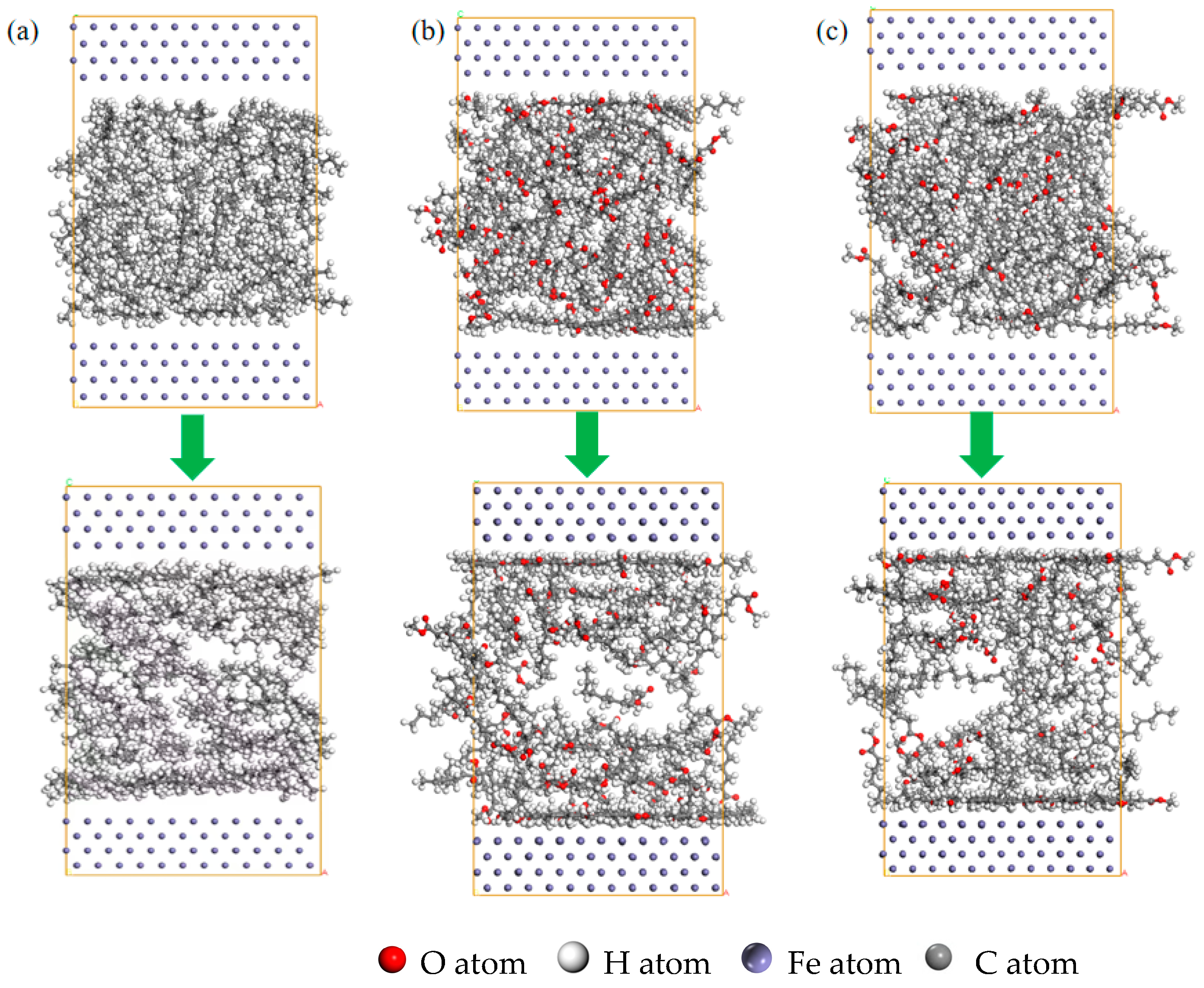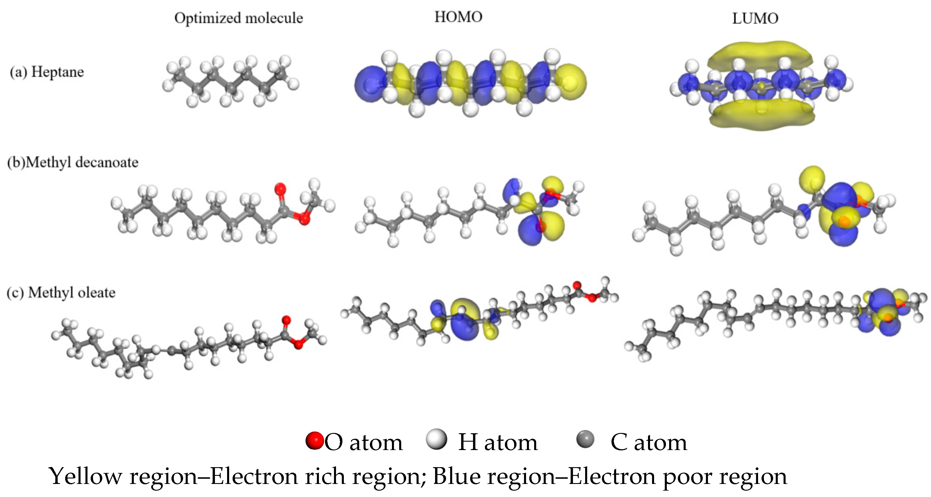 - Materials Studio simulation results revealed that on the α-Fe (110) crystal plane, the reactivity of C19H36O2, C11H22O2, and C7H16 decreased sequentially (based on density functional theory and Fukui index analysis). Frontier orbital analysis demonstrated that the LUMOs of C11H22O2 and C19H36O2 were localized at their terminal carbonyl groups, which significantly reduced steric hindrance for adsorption. This promoted their effective adsorption on the metal surface, facilitating the formation of more ordered, compact, and stable molecular films. Consequently, higher adsorption energy and absolute cohesive energy values were achieved, ultimately enhancing the anti-wear and friction-reduction performance of biodiesel at friction pair interfaces.