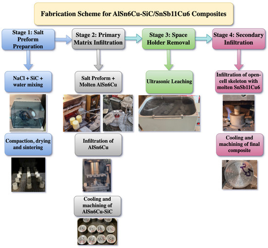 The manufacturing procedure consisted of four distinct stages. Initially, salt preforms were prepared using the replication methodology, where a 3D powder blending system homogenized NaCl particles (acting as leachable space holders), 5 wt.% SiC reinforcement, and 6 wt.% water. This mixture underwent compaction in a steel cylindrical mold under 1.5 MPa pressure to form preliminary preform structures. The resulting green compacts were subjected to thermal treatment at 200 °C for 2 h to eliminate residual moisture, followed by sintering at 800 ± 1 °C for 1 h with subsequent ambient temperature cooling to produce the final salt-leachable preforms. Subsequently, the NaCl preforms were preheated and positioned within a die maintained at 680 ± 2 °C, then infiltrated via squeeze casting with molten AlSn6Cu alloy under 80 MPa pressure for 60 s. The molten alloy penetrated the salt preform void spaces, establishing the AlSn6Cu-SiC skeletal framework, followed by ambient temperature cooling. The third stage involved salt space holder removal using an ultrasonic cleaning system (model UST28-200 B, Sofia, Bulgaria) containing distilled water heated to 79 °C. Finally, the resulting open-cell AlSn6Cu-SiC skeletal structures underwent secondary infiltration with molten SnSb11Cu6 babbitt alloy through liquid-state processing, effectively filling the porous network and creating the final composite material with enhanced tribological properties. This dual-infiltration approach combines the structural integrity of the AlSn6Cu-SiC framework with the superior bearing characteristics of the SnSb11Cu6 babbitt alloy. The fabrication scheme for AlSn6Cu-SiC/SnSb11Cu6 composites is presented in Figure 1.