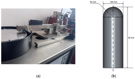 Tribological characterization was conducted using a pin-on-disk configuration with a Ducom TR-20 rotary tribometer (Bangalore, India) for dry-sliding wear evaluation of all test specimens (Figure 2a). The composite specimens were machined using a lathe to achieve spherical-tip geometries measuring 20 mm in height and 8 mm in diameter (Figure 2b). Testing parameters included a constant linear velocity of 1.0 m·s−1, applied normal load of 50 N and a total sliding distance of 420 m [22]. The counter-surface consisted of an EN-31 steel disk with 140 mm diameter, characterized by a surface roughness of 1.6 μm Ra and hardness of 62 HRC. The steel counterbody exhibited the following chemical composition (wt.%): C 0.90–1.20, Si 0.10–0.35, Mn 0.30–0.75, Cr 1.00–1.60, Si 0.20, with iron comprising the balance.