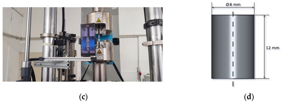 Mechanical characterization was performed through quasi-static compression testing of the open-cell composite materials under controlled loading conditions to simulate low-velocity deformation behavior (Figure 2c). Cylindrical test specimens (8 mm diameter × 12 mm height) were positioned between lubricated platens of a Zwick-Roell HA250 universal testing machine (Ulm, Germany) and subjected to compressive loading up to 60% engineering strain at a strain rate of 0.01 s−1 (Figure 2d). The experimental parameters were established based on preliminary investigations [28]. Load–displacement data acquisition was facilitated through integrated machine software. Both tribological and mechanical testing protocols incorporated multiple specimen replicates to ensure statistical reliability and reproducibility, with each experiment performed in triplicate for both materials.
