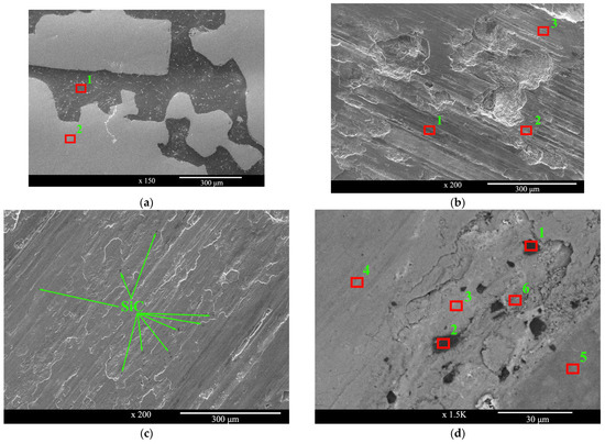 The worn surface of the SiC-reinforced composite (Figure 3c,d) presents a different morphology, characterized by hard SiC particles embedded within the deformed metallic matrix that interrupt the continuous smearing of the matrix and act as primary load-bearing constituents. During the initial stages of sliding, the softer babbitt and aluminum phases are preferentially removed from the surface. This process exposes the much harder, wear-resistant SiC particles, causing them to protrude from the matrix. These protruding SiC particles then act as the primary load-bearing asperities, shielding the surrounding metallic matrix from direct, severe contact with the counter-disk and significantly reducing the rate of material removal. High-magnification imaging (Figure 3d) combined with EDS analysis (Table 1, Zoomed zone) confirms the identity of these hard phases as SiC (Analysis Nos. 1 & 2), which are rich in silicon and carbon. The surrounding metallic regions (Analysis 3–6) again show a complex, heterogeneous composition, forming a mechanically mixed layer containing elements from the AlSn6Cu skeleton, the babbitt infiltrant, and transferred iron from the counter-disk. This suggests that during wear, the SiC particles protect the softer matrix from excessive material loss while contributing to the formation of a stable, multi-component tribolayer.