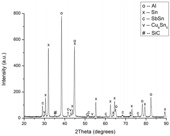 X-ray diffraction pattern of the AlSn6Cu-SiC composite infiltrated with SnSb11Cu6 babbitt alloy showing the identification of constituent phases.