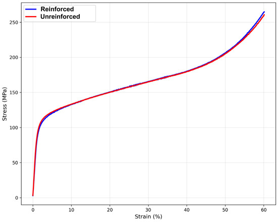 Compressive stress–strain curves showing enhanced mechanical performance of SiC-reinforced AlSn6Cu composites compared to unreinforced materials at 0.01 s−1 strain rate.