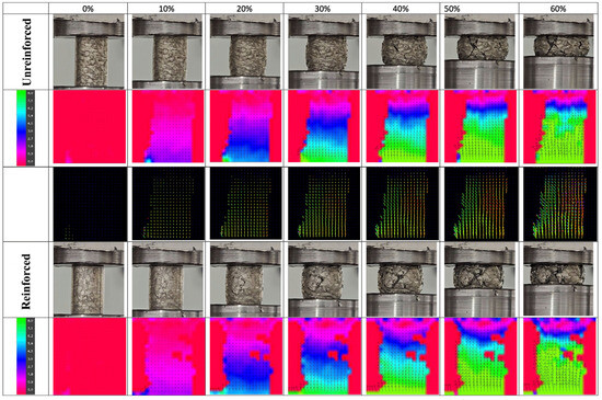 Digital Image Correlation analysis showing displacement field evolution during compression testing of unreinforced and SiC-reinforced open-cell AlSn6Cu composites from 0% to 60% engineering strain.
