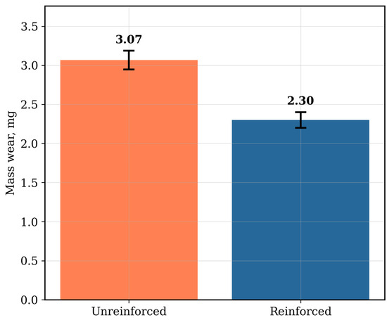 Mass wear comparison between unreinforced and SiC-reinforced AlSn6Cu-SiC/SnSb11Cu6 materials under dry-sliding conditions.