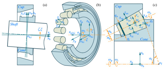 where denotes the conversion matrix from the oi-xiyizi frame to the ob-xbybzb frame, ξ and ζ are shaft/cone deflection angles; is conversion from the oi-xiyizi frame to the or-xryrzr frame, β, θ and ϕ denote rotation, tilt, and skew angles of the *j*-th roller, respectively; and ϑ is computed under the constraint that ri3 is maximized [6]. For calculations δi and δo, u denotes the displacement of the cone and cup in the oi-xiyizi frame, respectively.