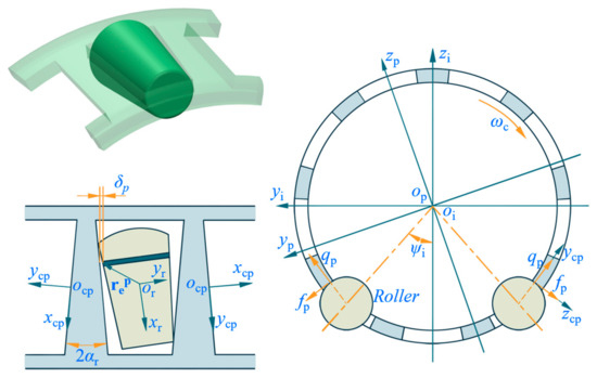Due to differences in displacement and velocity, the master–slave relationship of the cage and roller evolves dynamically. In Figure 3, the contact frame ocp-xcpycpzcp is located at the pocket wall that is in contact with the roller. Define Δp as the critical film thickness for contact state transition, and Δp is the composite roughness of contact surfaces. When pocket clearance δp at the *k*-th roller slice is greater than Δp, i.e., δp ≥ Δp, the slice/pocket is deemed in the hydrodynamic contact. The normal force qp generated by the film pressure and the traction force fp produced by the film shearing are [37]