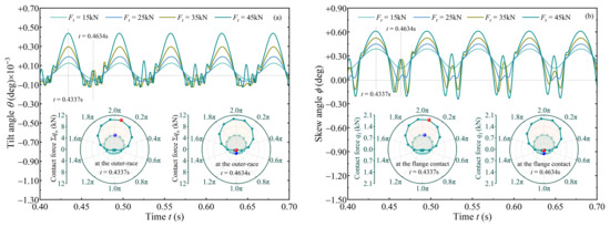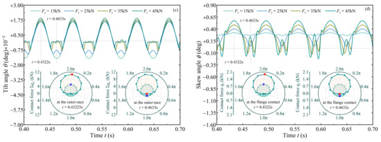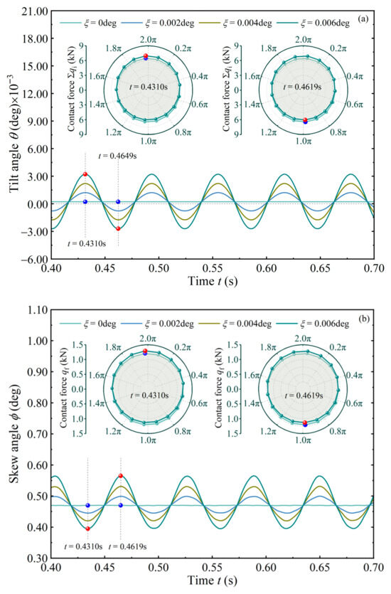 In Figure 4, if the shaft is in an aligned state (ξ = 0), the roller is already tilted at a negative state (θ < 0) and skewed at a positive state (ϕ > 0). This is associated with the uneven pressure distribution when it is in contact with the raceway and the flange [9]. Moreover, the angular vibrations are consistent with results in [8,14]. Once the shaft is deflected (ξ ≠ 0, deflected direction is based on the right-hand rule), the tapered roller presents a periodic vibration, and the period is about one revolution time of the roller. In addition, tilt and skew vibrations resemble two sine waves with opposite phases. Amplitude of the tilt angle θ is far greater than that when ξ = 0, and it is positively correlated with the deflected angle ξ. Roller skew magnitude is affected in a similar way. No matter how severe the shaft is deflected, the roller is always in a negative skewed state. Polar diagrams in Figure 4 depict distribution of contact forces (Σqi and qf) at the inner raceway and the flange when t = 0.4310 s and t = 0.4619 s. The shaft deflection causes uneven force distribution inside the TRB. The force distribution at the two times is basically similar, revealing that roller misalignment can be approximately predicted by the quasi-dynamic method [6,7].