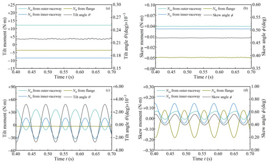 Moments of cup and cone acting on tapered roller, Fa = 30 kN, Fr = 0, and ωi = 3500 rpm. (a,b) without shaft deflection, ξ = 0; (c,d) with shaft deflection, ξ = 0.006 deg.