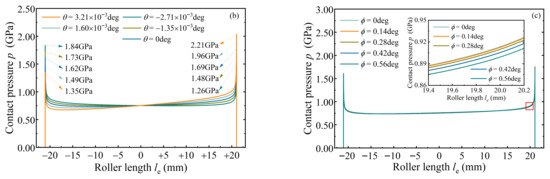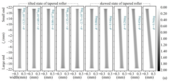 If the tapered roller is in an angular misalignment, the contact with raceways will deviate from expected state. Taking the inner raceway contact as object, referring to maximum load (Σqi)max and angular displacements in Figure 5, the dry contact under tilt and skew states was calculated with the conjugate gradient method (CGM). Among these, the tilt and skew angles serve as displacement constraints for the roller, a treatment analogous to that employed by John et al. [15]. Axis legends in Figure 7 for each cloud plot are the same. In Figure 7a of pressure contours, with the roller tilted from negative to positive, the maximum contact width changes from small end to large end of the roller. The contact area Ωp > 0 skews as the roller skews. In Figure 7b,c, the tilt effect on pressure profile along roller length is remarkable, and it exacerbates the stress edge effect at the roller-end. Because the roller profile crowning is ignored, the edge effect exists in the alignment state (θ = 0). Compared with the tilt, the skew has a slight influence on the pressure profile, which is due to the relatively large radius ratio (it is about 7.37) of the inner raceway to roller. So, although the tilt is slight, its impact on the roller/raceway pair is more profound. Under lubricated conditions, the roller’s angular displacement also induces a change in lubricant entrainment speed, thereby affecting film-forming state inside the bearing [23,24]. Meanwhile, the skew motion is a potential cause of heat generation in roller bearings [27].
