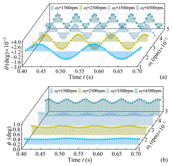 The roller’s angular displacement versus time at different bearing speeds, Fa = 30 kN, Fr = 0, and ξ = 0.004 deg. (a) tilt motion; (b) skew motion.