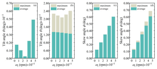 Figure 10a,b displays variations of maximum θmax and average θavg with bearing speed ωi. For ξ = 0, the two are very close, both first decreasing and then increasing as ωi rises. In fact, as a result of the gyroscopic effect, the roller tilt transitions from negative at ωi = 500 rpm to positive at ωi = 4500 rpm. For ξ = 0.004 deg, θmax follows the same variation trend, but θavg shows a decreasing trend. θmax is one order of magnitude higher than when ξ = 0, indicating that the shaft deflection leaves the roller in a serious misalignment state. In Figure 10c,d, increasing trends of the roller skew with bearing speed ωi are basically the same, and skew amplitude is not much different under the ξ = 0 and ξ ≠ 0 cases. As ωi varies from 500 rpm to 4500 rpm, ϕmax is about 0.12, 0.23, 0.34, 0.47, and 0.60 deg subjected to aligned shaft, and it is about 0.13, 0.25, 0.39, 0.53, and 0.68 deg subjected to misaligned shaft.