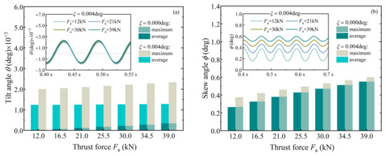 Since axial force Fa will contribute to skew and tilt moments, its increase would inevitably deteriorate the roller’s alignment state. Figure 11 exhibits the deterioration when the TRB carries pure axial force Fa and the shaft is deflected at 0 deg and 0.004 deg. Whether the shaft is deflected or not, tilt fluctuation under different axial forces Fa is consistent. Tilt amplitude increases gradually by a small amount. For the skew motion, the effect of Fa is remarkable, and the amplitude increase is large. For ξ = 0, with Fa varying from 12 kN to 39 kN, θmax is raised from 2.10 × 10−5 deg to 3.37 × 10−4 deg and ϕmax is raised from 0.27 deg to 0.55 deg. For ξ = 0.004 deg, θmax and ϕmax are in the ranges of 2.00 × 10−3~2.33 × 10−3 deg and 0.38~0.60 deg, respectively. The average ϕavg when ξ = 0.004 deg is quite close to ϕavg or ϕmax when ξ = 0. Under the shaft-deflected case, the change of roller skew with axial force Fa is similar to that in [8,14].
