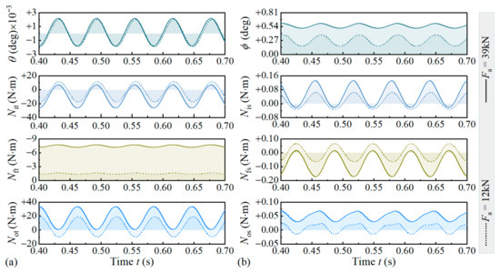Figure 12 displays moments under different axial forces (ξ = 0.004 deg). In Figure 12a, although Fa minimally affects the roller tilt, its perturbation on the tilt moment is pronounced. The moment amplitude increases variably across positions, and Not shifts toward a positive value. Differing sensitivities of the tilt moment and tilt angle to Fa may relate to the structural characteristics of TRBs. In Figure 12b, driven by the axial force Fa, the fluctuation amplitude of the skew moment increases, and Nos similarly shifts toward positive values. Additionally, the disturbance to the flange moment Nfs is relatively obvious.