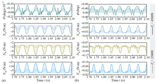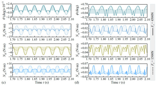 Figure 14c,d illustrates the ξ = 0.003 deg case, and moments acting on the roller are significantly more complex. For Fr = 1500 N, the tilt moment of the rings exerting on the roller is higher than that when ξ = 0. The skew moment loses sinusoidal characteristics, and multiple peaks appear within the minor load-carrying zone. Additionally, skew moment from the outer raceway and flange increases, while little change occurs at the inner raceway. For Fr = 4500 N, the minor and major zones re-emerge with modified boundaries, and tilt and skew moments decrease universally compared to that when ξ = 0. Case comparison shows that at Fr = 1500 N, the deflected shaft reverses overall time trends of Not, Nit, Nos, Nis, and Nfs, and at Fr = 4500 N, it only affects the overall time trend of Nit. This is actually a reflection of structural nonlinearity of TRBs.